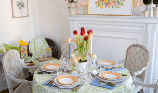 Through the art of trompe l'oeil, "to fool the eye," paper, rattan & textiles play together to set a colorful spring table.