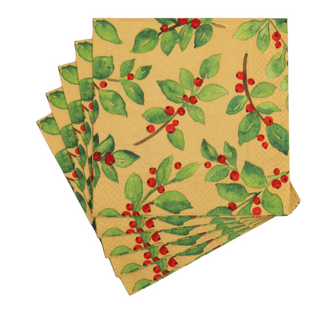 Painted Holly Gold Recycled Cocktail Napkins - includes 20 Cocktail Napkins