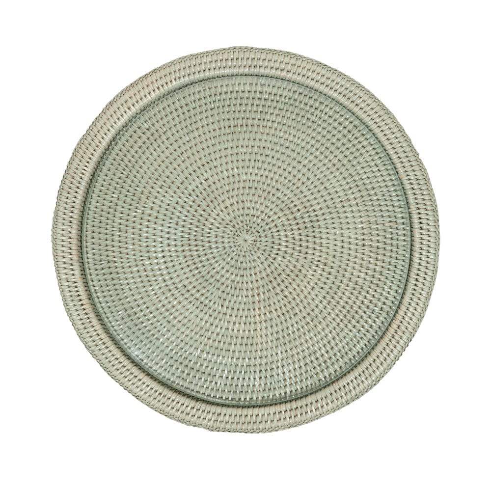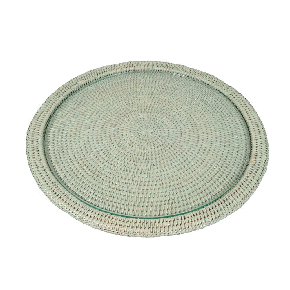 Rattan Round Cheese Tray with Glass insert in Green - 17" Dia. x 1"H