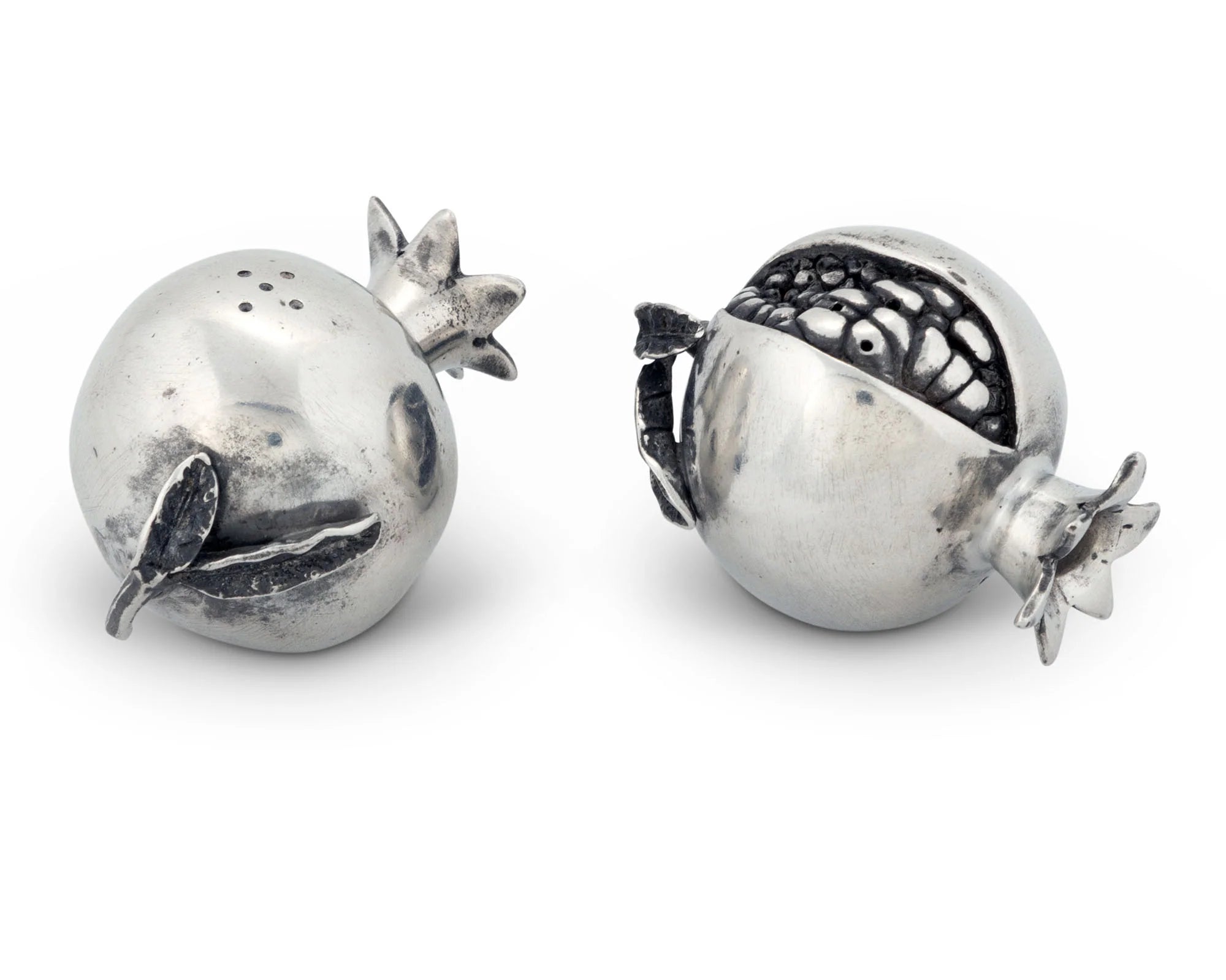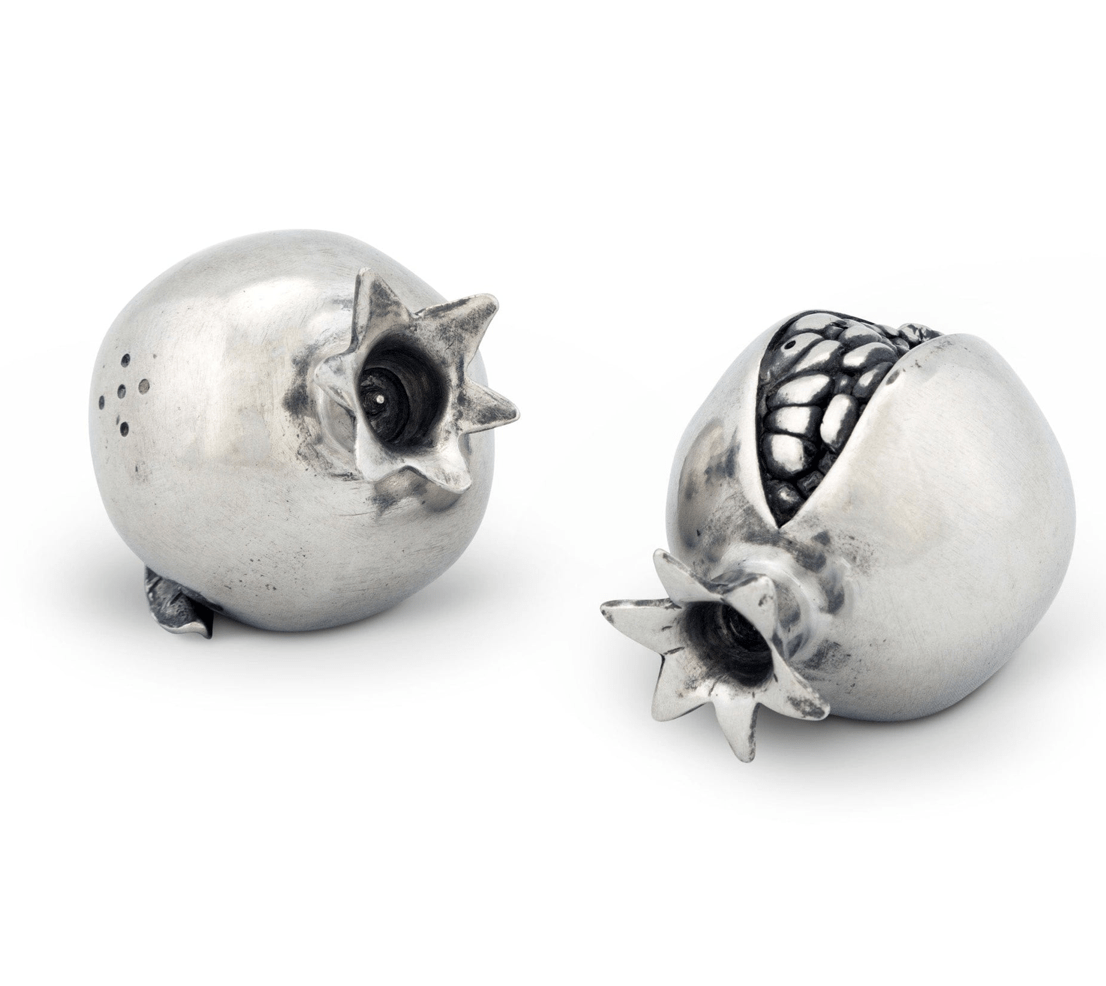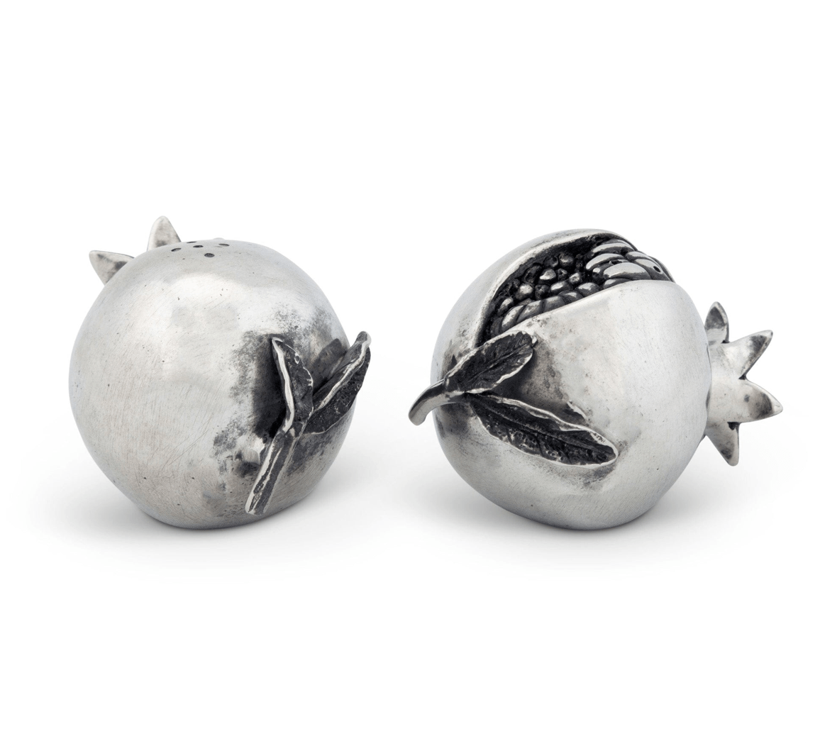 Celebrate the bounty of nature with our Pomegranate Salt and Pepper Set, designed to bring a touch of the garden to your table. Made from premium pewter, this elegant duo showcases two pomegranates adorned with crown-like stems and smooth surfaces. One fruit is artfully split open to display detailed seeds, while the other is accented by a delicately crafted leaf, making this set a stunning and functional addition to your dining experience..